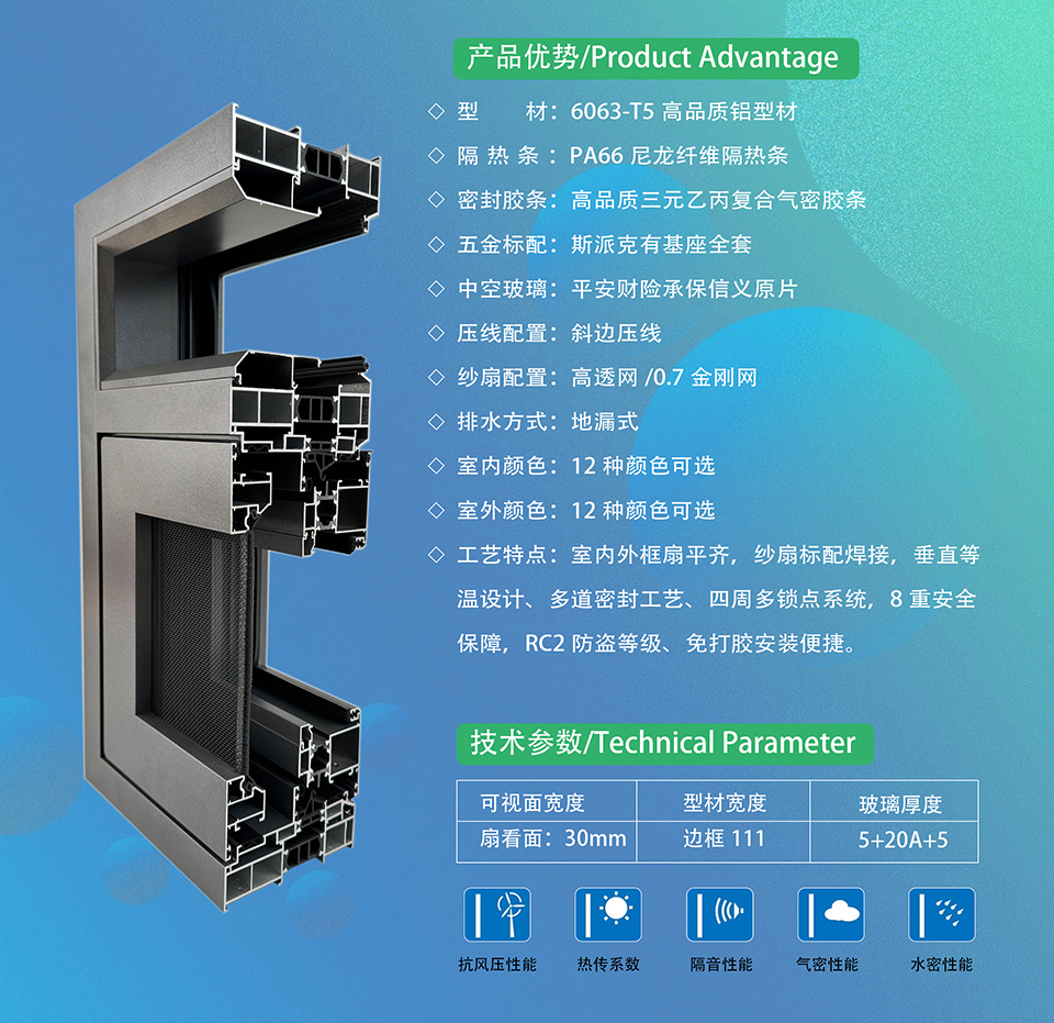 工艺特点:室内外框扇平齐,纱扇标配焊接,垂直等温设计、多道密封工艺、四周多锁点系统,8重安全保障,RC2 防盗等级、免打胶安装便捷: